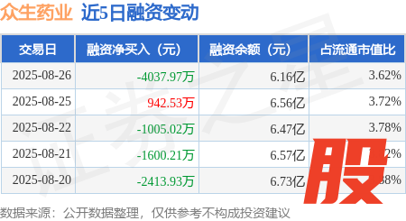 本站消息,8月26日,众生药业(002317)融资买入8943.47万元,融资偿还1.3亿元,融资净卖出4037.97万元,融资余额6.16亿元。